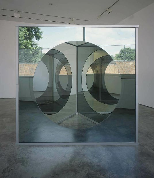 Dan Graham (1942–2022). Seine Arbeit verbindet Architektur, Skulptur und Konzeptkunst auf radikal interaktive Weise. Besonders bekannt wurde er durch seine Pavillons, transparente Strukturen aus Glas und Stahl, die Spiegelungen, Durchblicke und Bewegungen der Betrachter selbst zum Teil der Kunst machen.